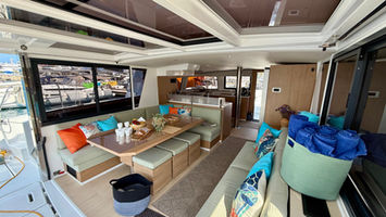 3 υπαίθριοι χώροι καθιστικού: Σταθμός Flybridge με πανοραμικό χώρο χαλάρωσης με μεγάλο κλειστό μπιμίνι και τραπέζι καθιστικού, μεγάλο ξύλινο τραπέζι φαγητού στο σαλόνι-κόκπιτ μαζί με ξεχωριστό χώρο σαλονιού & ηλιοθεραπεία στο μπροστινό πιλοτήριο.